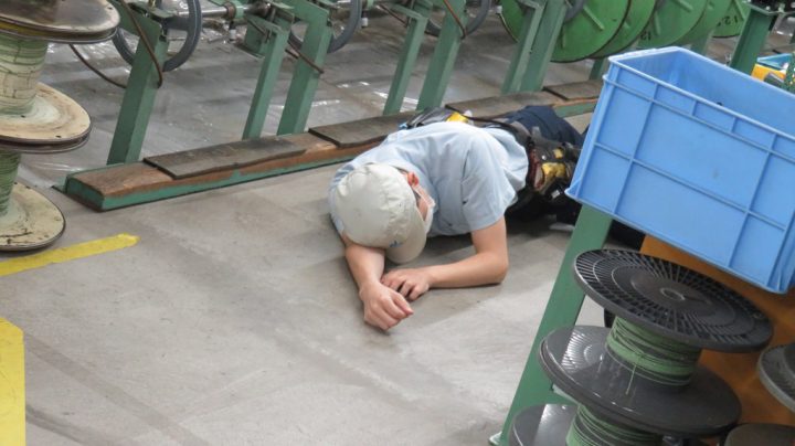 地震発生後に突然人が倒れていたらどうなるかの検証も行いました。